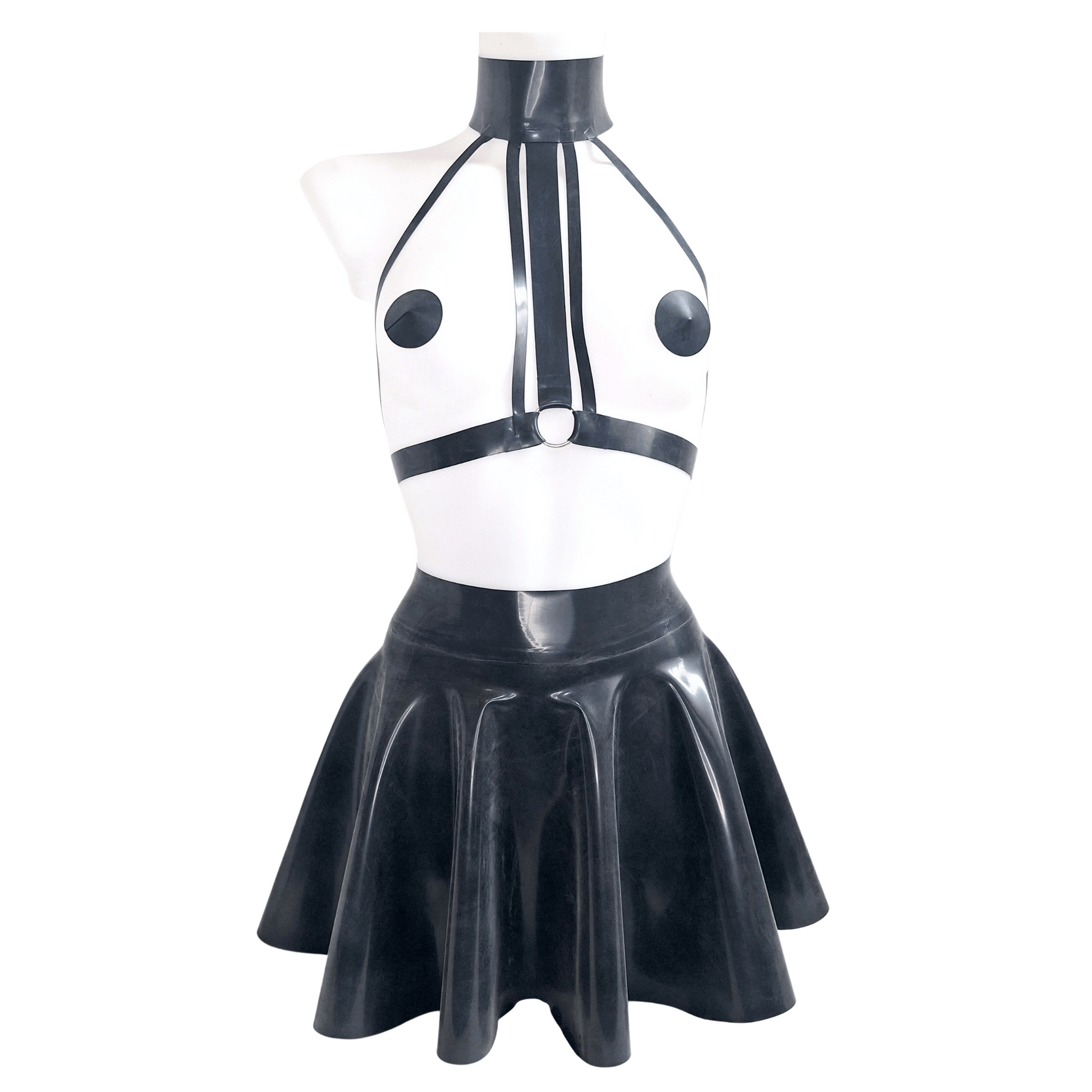 Introducing our Black Latex Chest Harness, Skater Skirt & black latex round nipple pasties set, designed specifically for those seeking a fetish-inspired look that exudes confidence and allure.