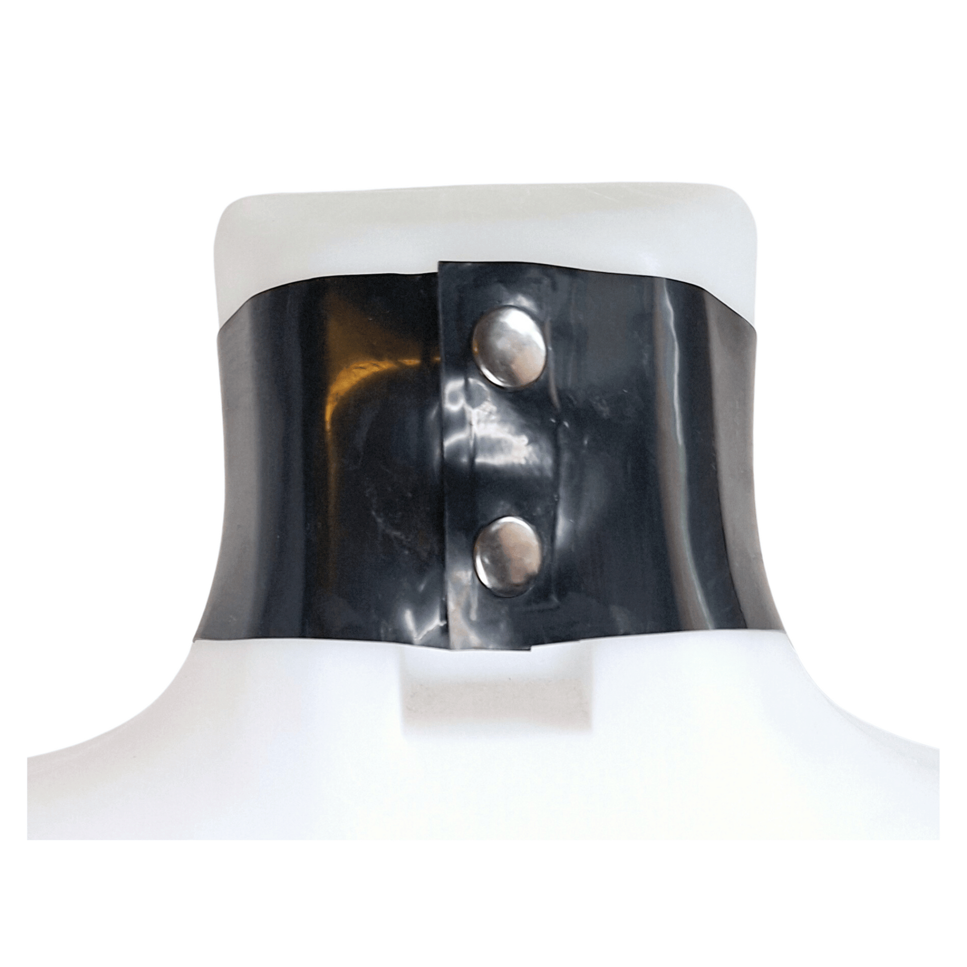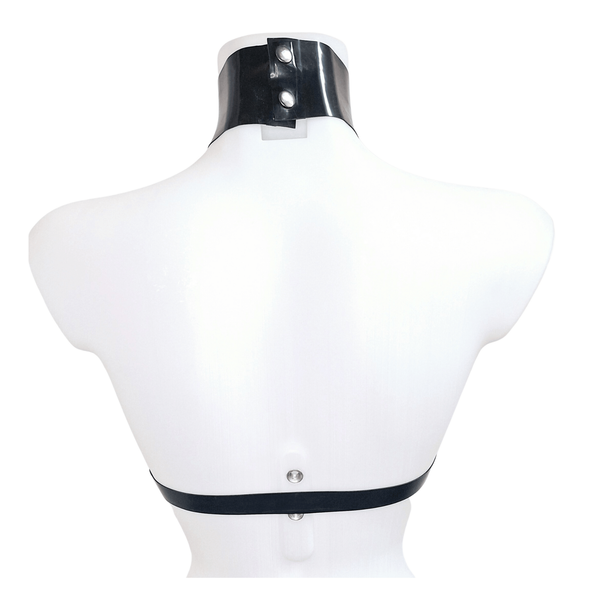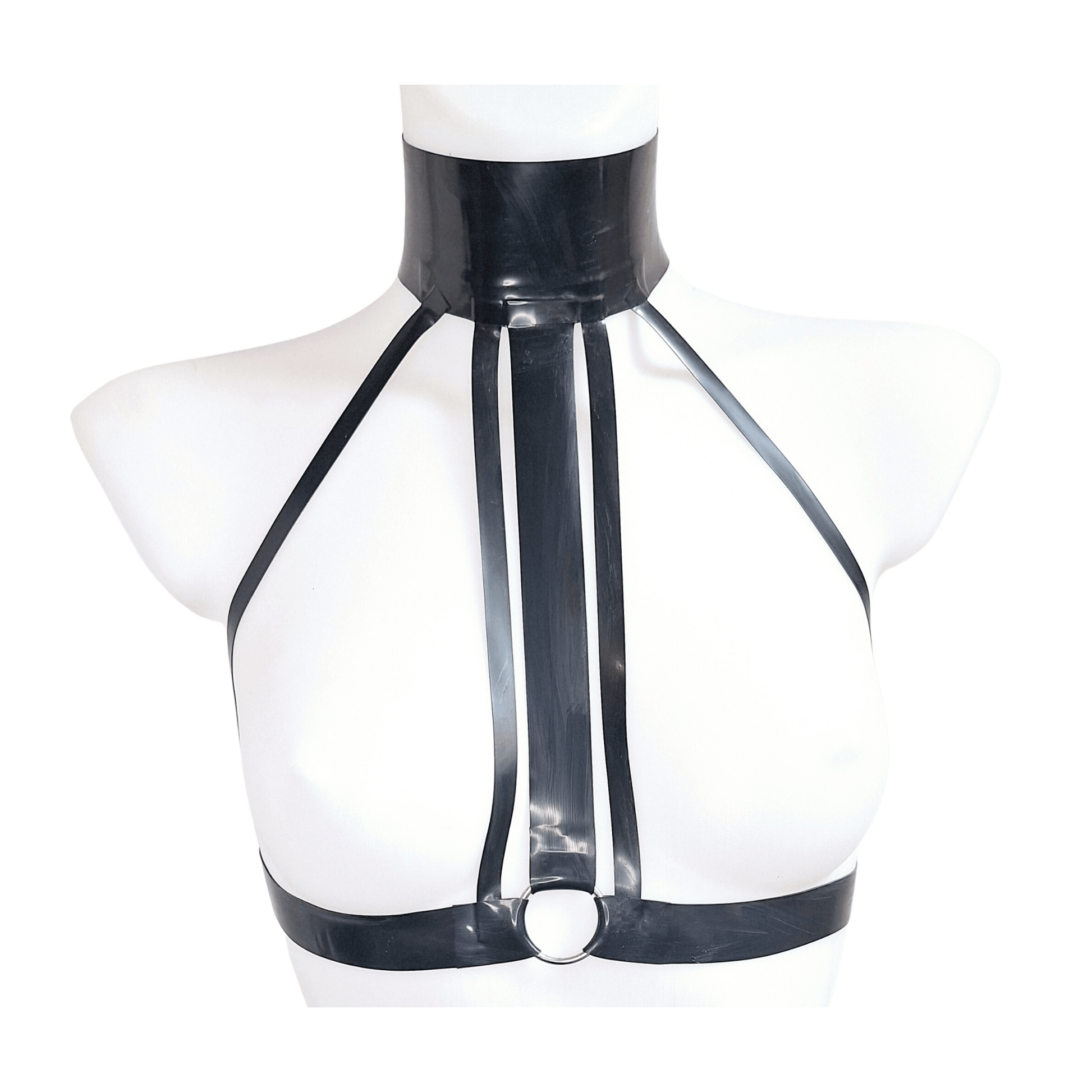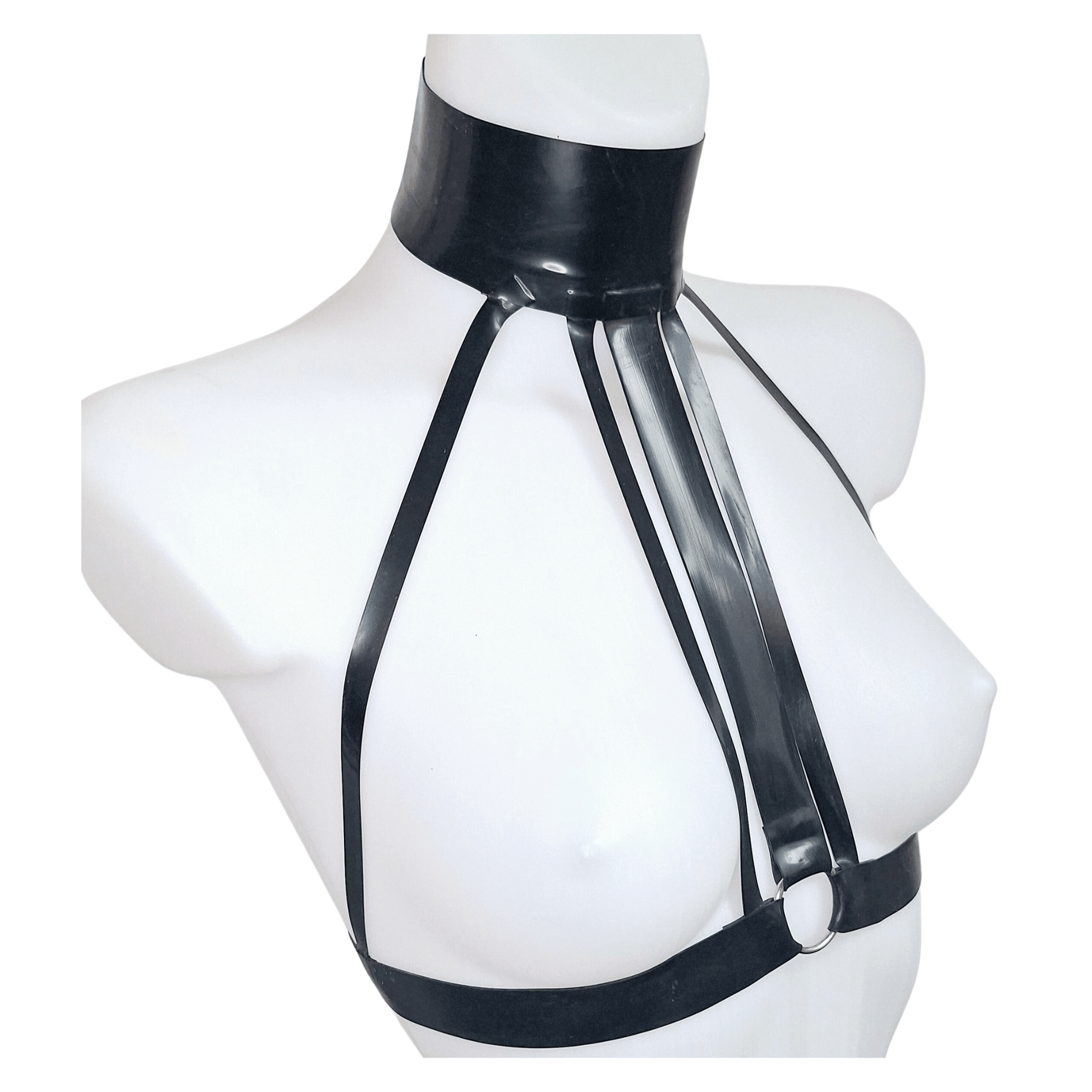 The chest harness is crafted from heavy 0.80mm latex, ensuring a sturdy and supportive fit. It features a wide choker/collar adorned with metal snap popper fastenings. The three central straps converge towards a silver tone O ring, creating a focal point that accentuates your figure. Side straps stylishly frame the breasts, adding a provocative element to the overall design.