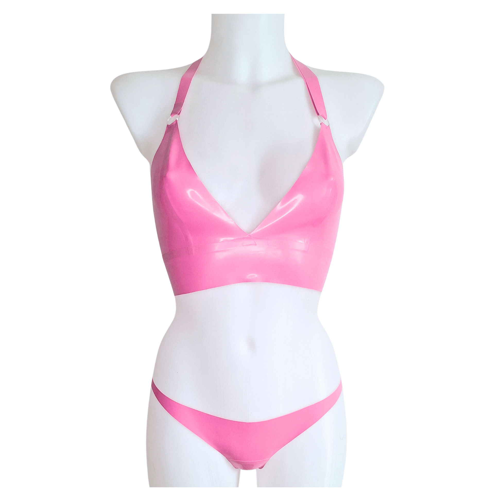 Introducing our Bubblegum Pink Latex Bralette & Bikini Style Knickers & latex skater skirt Set. This vibrant and playful outfit is perfect for those looking to make a bold fetish fashion statement.