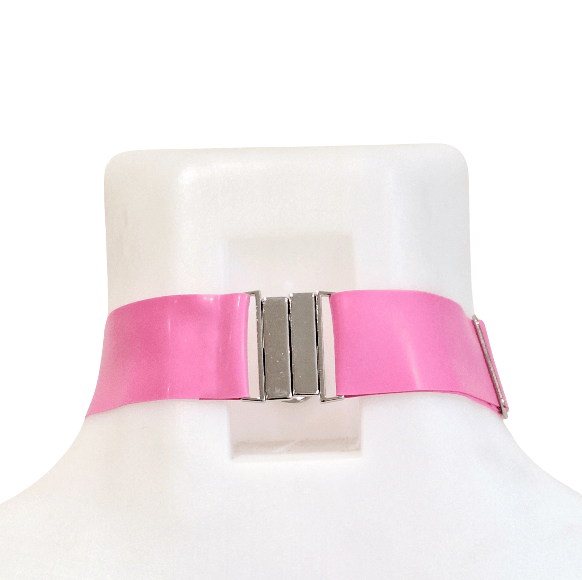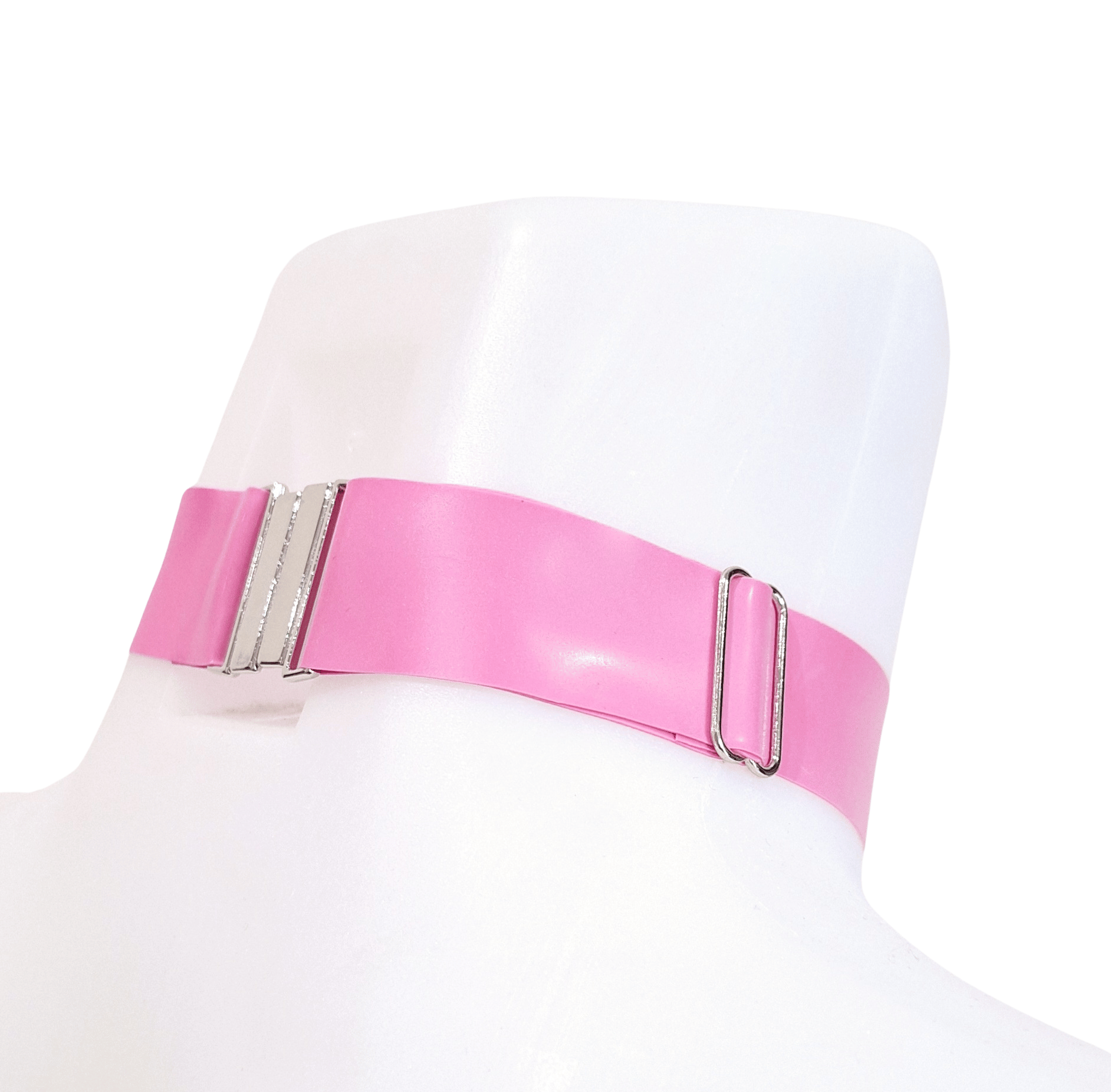 A Bubblegum Pink Latex Rubber choker with a adjustable slider and silver tone clasp.