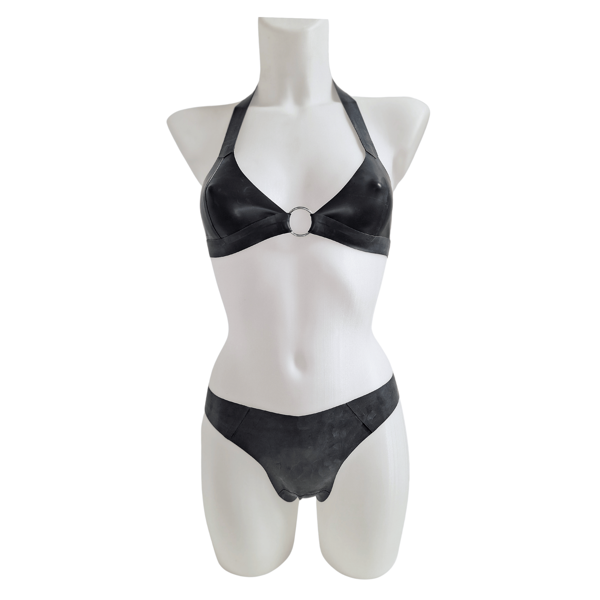 Introducing the classic black O ring bra and thong underwear set, the perfect combination of elegance and sensuality. Made to order in sizes XS to XL, this set is crafted with the finest materials and designed to fit your body like a glove.