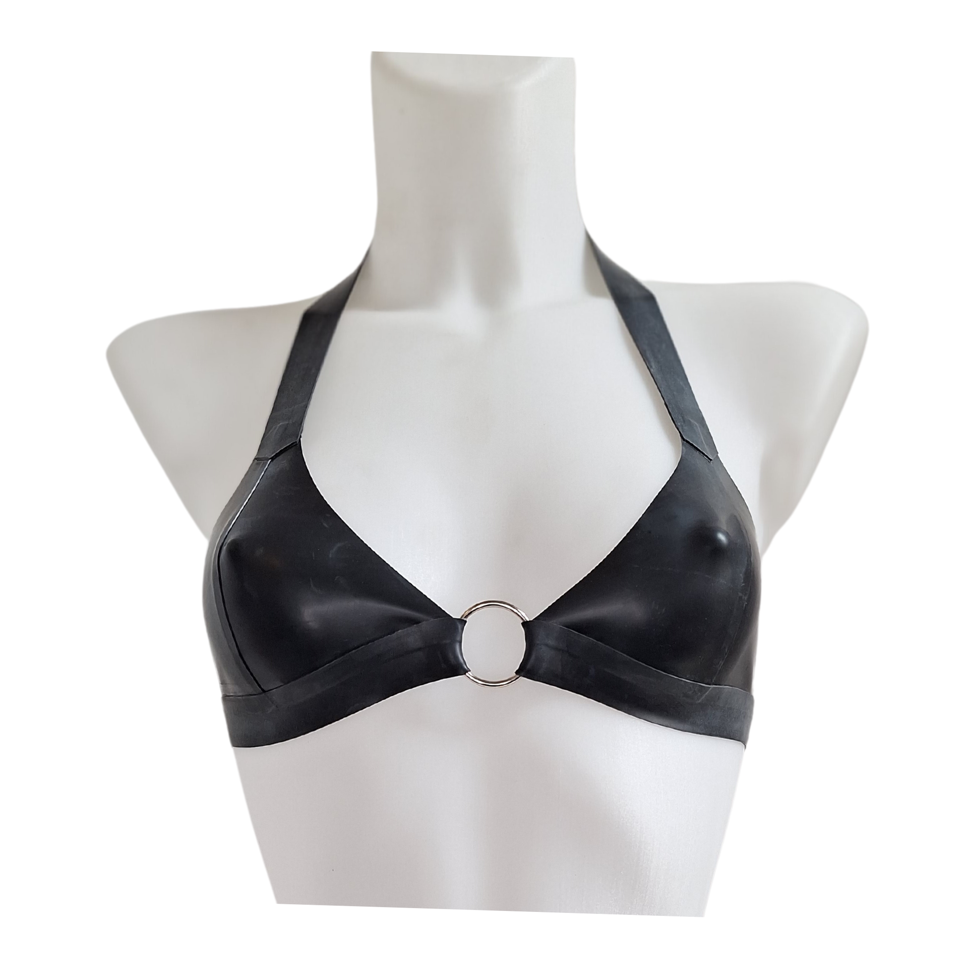 Latex soft cup halter bralette connected in the center by a silver tone O ring with a halter strap, pull on style with no fastenings. The band & halter strap are made with heavy 1.05mm latex and the cups are 0.33mm or 0.40mm depending on the colour.