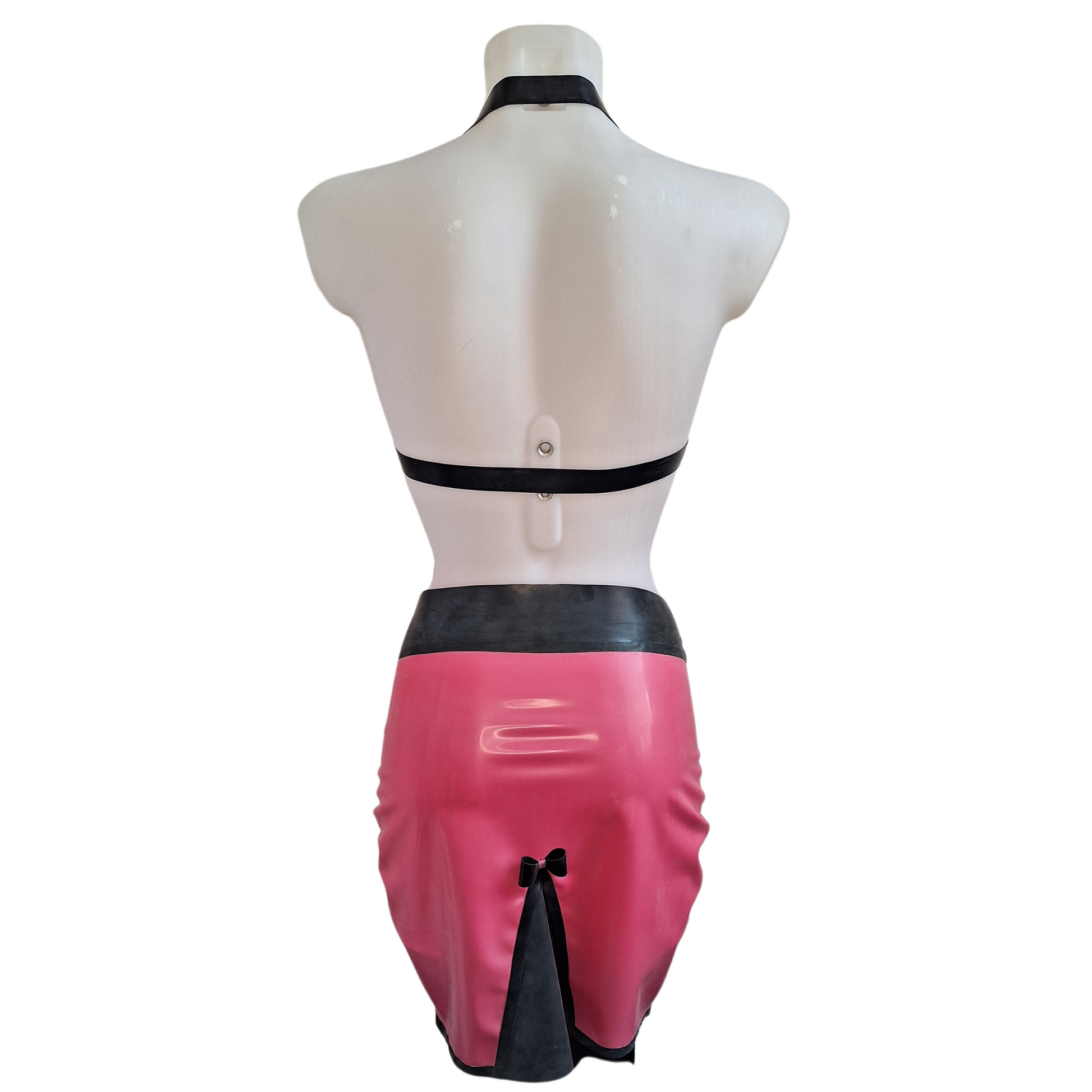 Bring out your inner Barbie with this Metallic Fuchsia Pink & Black Kick Flare Skirt & O Ring Bra Set! This set includes a beautiful O ring bra and a matching kick flare skirt, both finished in metallic fuchsia pink with black accents. The skirt features a black kick flare at the back, which is trimmed in black and finished with a cute black bow, adding a touch of elegance to your outfit.