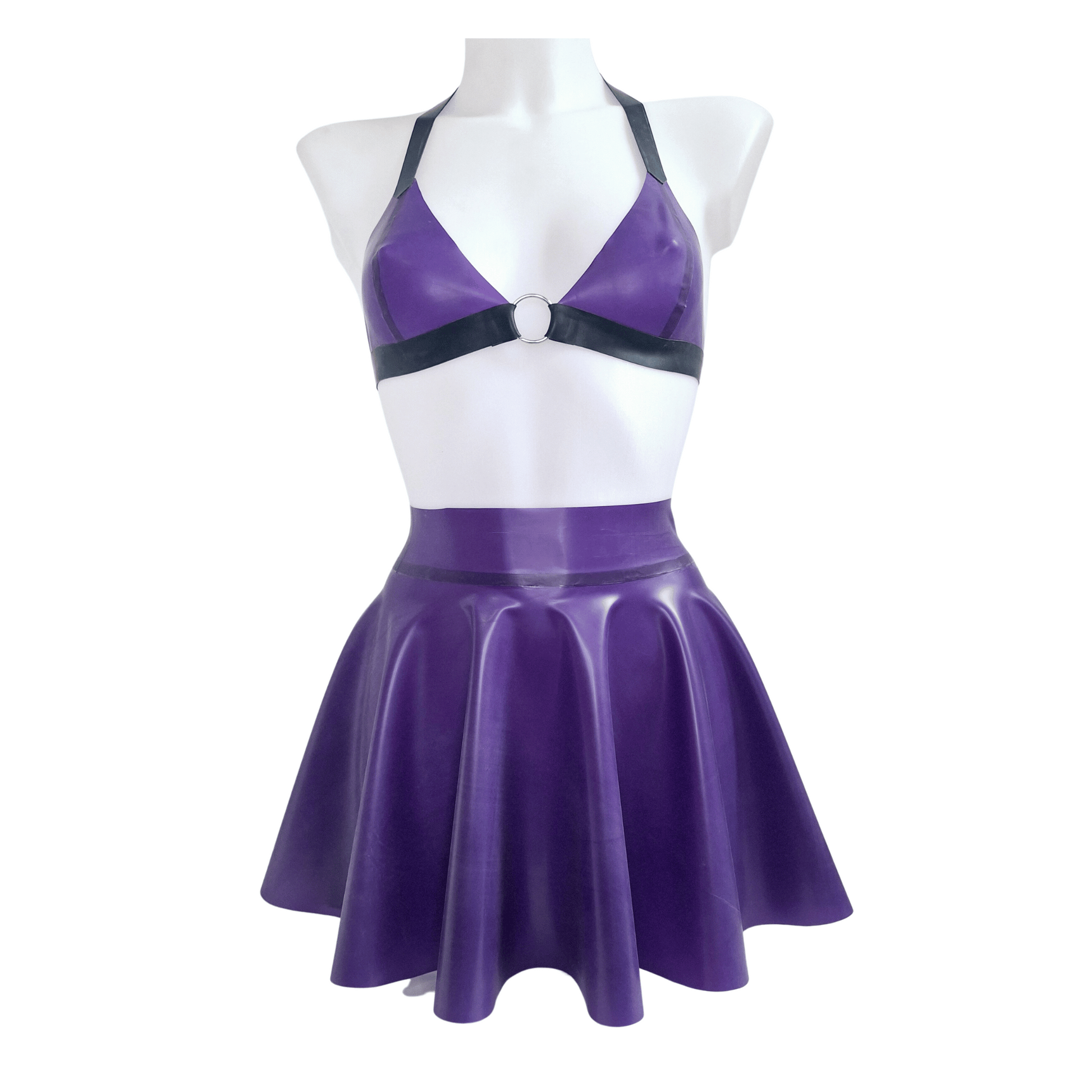 Semi Transparent Mauve Purple Latex O Ring Bra, Knickers & Skater Skirt Set